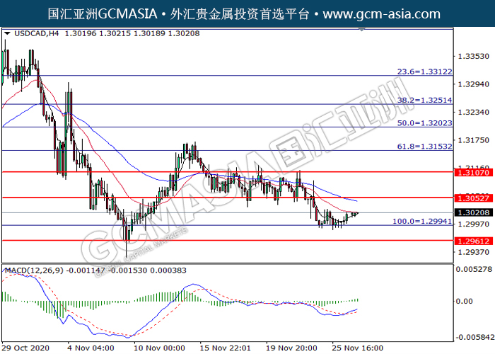 20201127 USDCAD by willy | Nov 27, 2020 | 美元兑加元 | 0 comments GCMAsia-USDCAD USDCAD 2020-11-27 USDCAD,H1: 美加低位反弹。MACD动能持续略增,短期可关注多头为主。上方关注1.3055压力和1.3105压力,下方关注1.2995支撑1.2960支撑。
