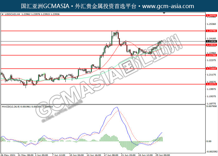 300621 USDCAD by willy | Jun 30, 2021 | 美元兑加元 | 0 comments USDCAD,H4: 美加突破前期压力,震荡上行。MACD多头动能略增,短期可关注多头为主。上方关注1.2480压力和1.2605压力,下方关注1.2360支撑1.2275支撑。