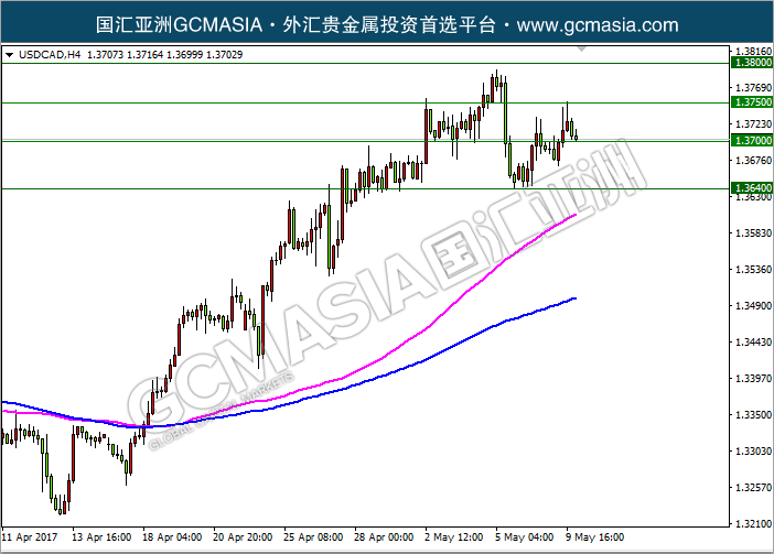 USDCAD H4:美加高位盘整,区间震荡,动能偏弱;目前回测前期支撑,空头回调较强,短期关注能否下破,下破继续关注空头回调势力;上方关注1.3750阻力和1.3800阻力;下方关注1.3700支撑和1.3640支撑.
