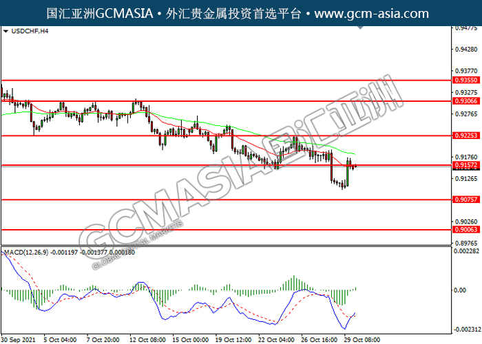 011121 USDCHF by willy | Oct 31, 2021 | 美元兑瑞士法郎 | 0 comments USDCHF,H4: 美瑞震荡上行,目前测试前期压力。MACD多头动能略增,若突破可关注多头为主。上方关注0.9155压力和0.9225压力,下方关注0.9075支撑和0.9005支撑。