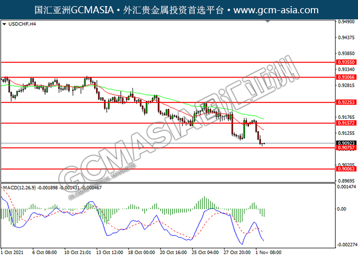 20211102 USDCHF by willy | Nov 2, 2021 | 美元兑瑞士法郎 | 0 comments USDCHF,H4: 美瑞震荡下行,目前测试前期支撑。MACD空头动能略增,短期可关注空头为主。上方关注0.9155压力和0.9225压力,下方关注0.9075支撑和0.9005支撑。