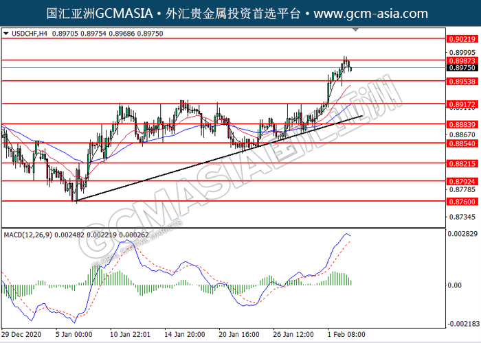 030221 USDCHF by willy | Feb 3, 2021 | 美元兑瑞士法郎 | 0 comments GCMAsia-USDCHF USDCHF 2021-02-03 USDCHF,H4:美瑞高位承压后回落。MACD多头动能略减,短期可关注空头为主。上方关注0.8985压力和0.9020压力,下方关注0.8955支撑和0.8915支撑。