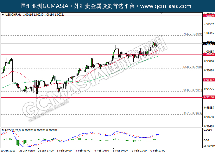 070219 USDCHF by willy | Feb 7, 2019 | 美元兑瑞士法郎 | 0 comments GCMAsia - USDCHF USDCHF USDCHF,H1:美瑞震荡上行。MACD多头动能有所略减,短期关注空头回调。上方关注1.0040压力和1.0080压力,下方关注1.0000支撑和0.9970支撑。