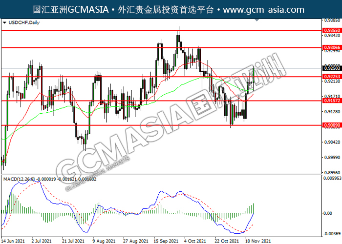 20211116 USDCHF by willy | Nov 16, 2021 | 美元兑瑞士法郎 | 0 comments USDCHF,Daily: 美瑞突破前期压力,震荡上行。MACD多头动能略增,短期可关注多头为主。上方关注0.9305压力和0.9355压力,下方关注0.9225支撑和0.9155支撑。