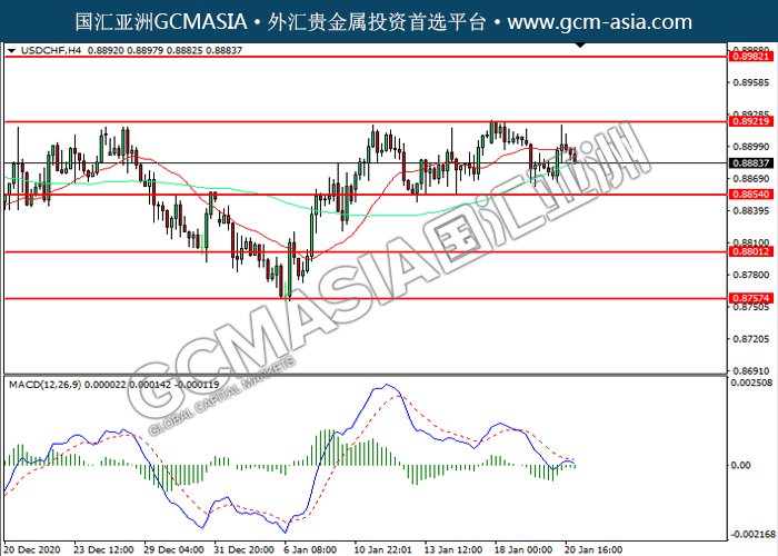 USDCHF,H4:美瑞近期高位承压回落。MACD显示空头信号,动能略减,短期可继续看空方向为主。上方关注0.8920压力和0.8980压力,下方关注0.8855支撑和0.8800支撑。