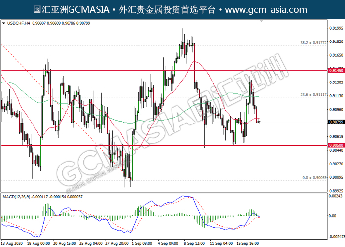 20200918 USDCHF by willy | Sep 17, 2020 | 美元兑瑞士法郎 | 0 comments GCMAsia - USDCHF USDCHF 2020-09-18 USDCHF,H4:美瑞震荡下行。MACD多头动能有所略减,短期关注空头势力。上方关注0.9110压力和0.9145压力,下方关注0.9050支撑和0.9005支撑。