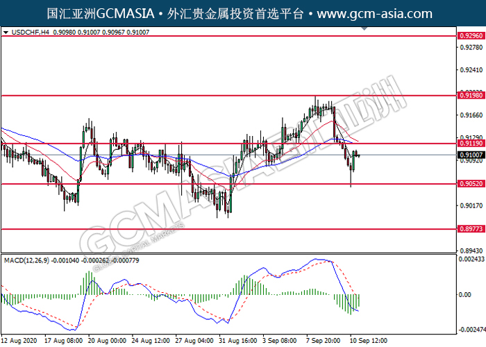 20200911 USDCHF by willy | Sep 11, 2020 | 美元兑瑞士法郎 | 0 comments GCMAsia-USDCHF USDCHF 2020-09-11 USDCHF,H4:美瑞低位反弹。MACD转向多头,动能略增,短期可关注多头走势为主。上方关注0.9120压力和0.9200压力,下方关注0.9050支撑和0.8970支撑。
