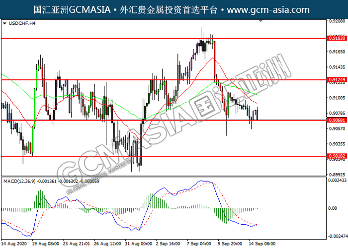 USDCHF,H4:美瑞震荡下行,目前测试前期支撑。然而,MAC空头动能有所略减,短期关注技术性回调为主。上方关注0.9125压力和0.9185压力,下方关注0.9070支撑和0.9020支撑。