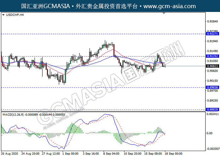 20200918 USDCHF-午间 by keyk | Sep 18, 2020 | 美元兑瑞士法郎 | 0 comments GCMAsia - USDCHF USDCHF 2020-09-18 USDCHF,H4:美瑞高位承压回落下行。然MACD多头动能有所略减,短期继续看空回调为主。上方关注0.9125压力和0.9225压力,下方关注0.8985支撑和0.8880支撑。