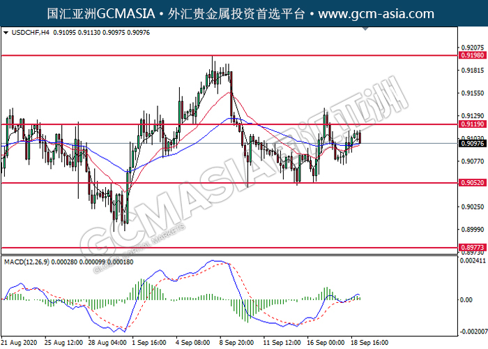 20200921 USDCHF-午间 by skylow | Sep 21, 2020 | 美元兑瑞士法郎 | 0 comments GCMAsia - USDCHF USDCHF 2020-09-21 USDCHF,H4:美瑞高位承压后回落。MACD转向空头,动能略减,短期可关注空头走势为主。上方关注0.9120压力和0.9200压力,下方关注0.9050支撑和0.8975支撑。