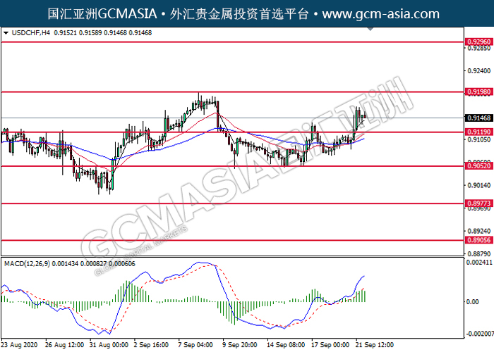 20200922 USDCHF-午间 by willy | Sep 22, 2020 | 美元兑瑞士法郎 | 0 comments GCMAsia-USDCHF USDCHF 2020-09-22 USDCHF,H4:美瑞突破后持续上行。MACD转向多头,动能略增,短期可关注多头走势为主。上方关注0.9200压力和0.9295压力,下方关注0.9120支撑和0.9050支撑。