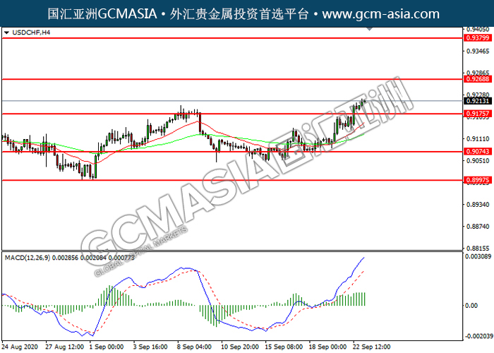 USDCHF,H4:美瑞突破前期压力,震荡上行。MACD多头动能略增,短期可关注多头走势为主。上方关注0.9270压力和0.9380压力,下方关注0.9175支撑和0.9075支撑。