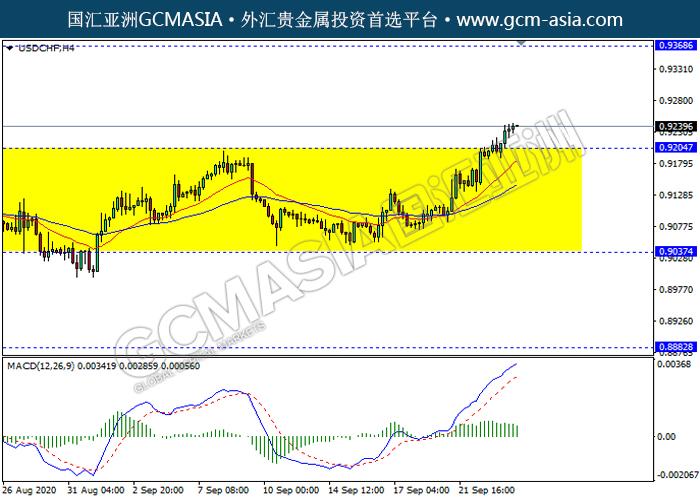 USDCHF,H4:美瑞突破前期压力,震荡上行。然而,MACD多头动能有所略减,短期关注技术性空头回调为主。上方关注0.9370压力和0.9455压力,下方关注0.9205支撑和0.9035支撑。