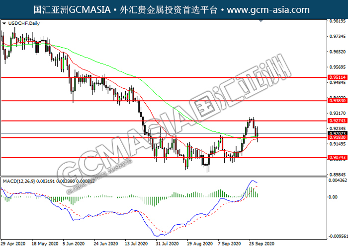 USDCHF,Daily:美瑞高位回落,目前测试前期支撑。MACD多头动能略减,若下破可关注空头走势为主。上方关注0.9275压力和0.9385压力,下方关注0.9185支撑和0.9075支撑。
