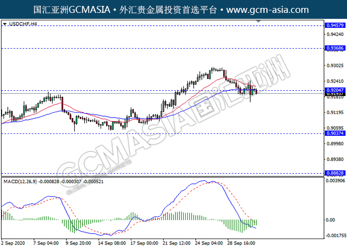 USDCHF,H4:美瑞震荡下行,目前测试前期支撑。MACD显示空头,动能持续略减,若突破继续看空为主。上方关注0.9370压力和0.9455压力,下方关注0.9205支撑和0.9035支撑。