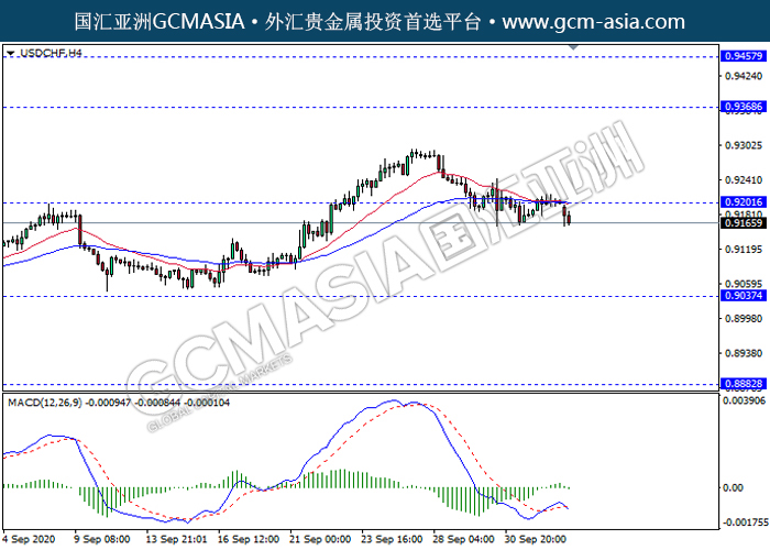 20201005 USDCHF-午间 by keyk | Oct 5, 2020 | 美元兑瑞士法郎 | 0 comments GCMAsia - USDCHF USDCHF 2020-10-05 USDCHF,H4:美瑞高位承压回落。MACD多头动能略减,短期继续关注空头回调趋势为主。上方关注0.9200压力和0.9370压力,下方关注0.9035支撑和0.8880支撑。