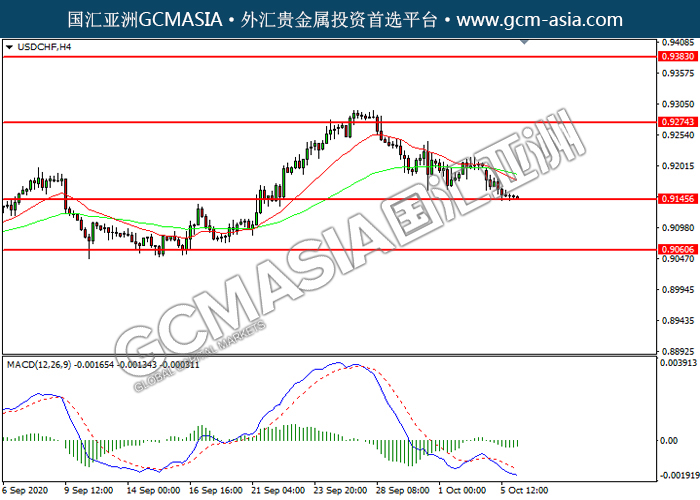 USDCHF,H4:美瑞震荡下行,目前测试前期支撑。然而,MACD空头动能略减,短期可关注技术性回调为主。上方关注0.9275压力和0.9385压力,下方关注0.9145支撑和0.9060支撑。