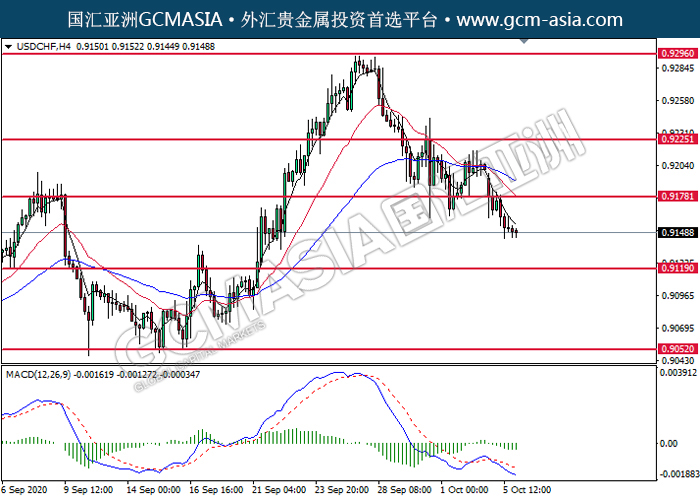 20201006 USDCHF-午间 by keyk | Oct 6, 2020 | 美元兑瑞士法郎 | 0 comments GCMAsia - USDCHF USDCHF 2020-10-06 USDCHF,H4:美瑞突破后持续下行。MACD空头动能偏强,短期继续关注空头回调趋势为主。上方关注0.9180压力和0.9225压力,下方关注0.9120支撑和0.9050支撑。