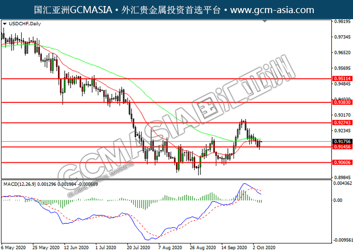 USDCHF,Daily:美瑞震荡下行,目前测试前期支撑。MACD空头动能略增,若下破可关注空头为主。上方关注0.9275压力和0.9385压力,下方关注0.9145支撑和0.9060支撑。
