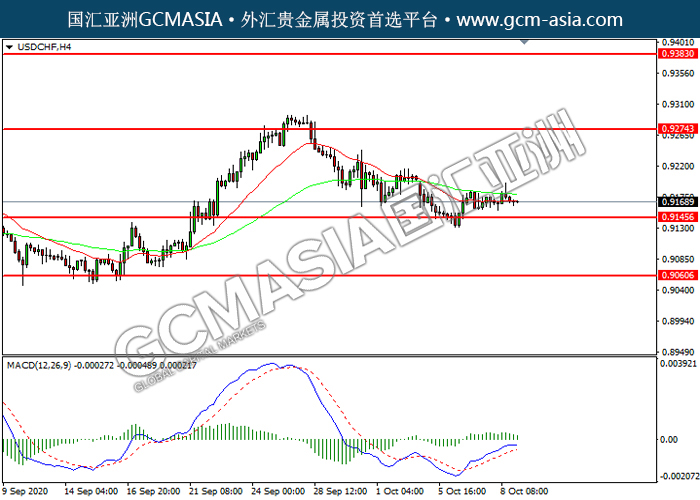 USDCHF,H4:美瑞震荡盘整,目前靠近前期支撑。MACD多头动能略减,若下破可关注空头为主。上方关注0.9275压力和0.9385压力,下方关注0.9145支撑和0.9060支撑。