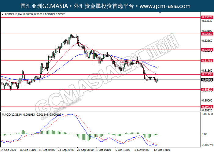 USDCHF,H4:美瑞突破后持续下行。然而,MACD空头动能略减,短期可关注技术性上涨为主。上方关注0.9120压力和0.9180压力,下方关注0.9050支撑和0.8975支撑。