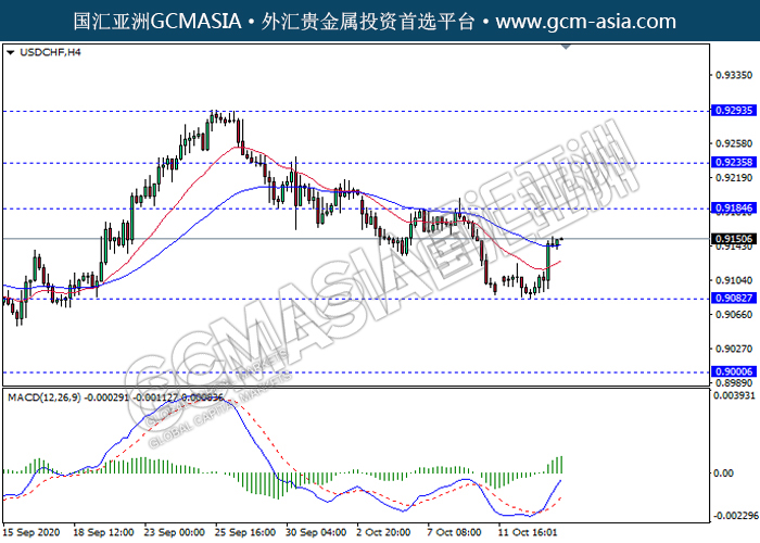 20201014 USDCHF by keyk | Oct 14, 2020 | 美元兑瑞士法郎 | 0 comments GCMAsia - USDCHF USDCHF 2020-10-14 USDCHF,H4:美瑞触底反弹上性。MACD动能持续略增,中期继续关注多头反弹趋势为主。上方关注0.9185压力和0.9235压力,下方关注0.9080支撑和0.9000支撑。
