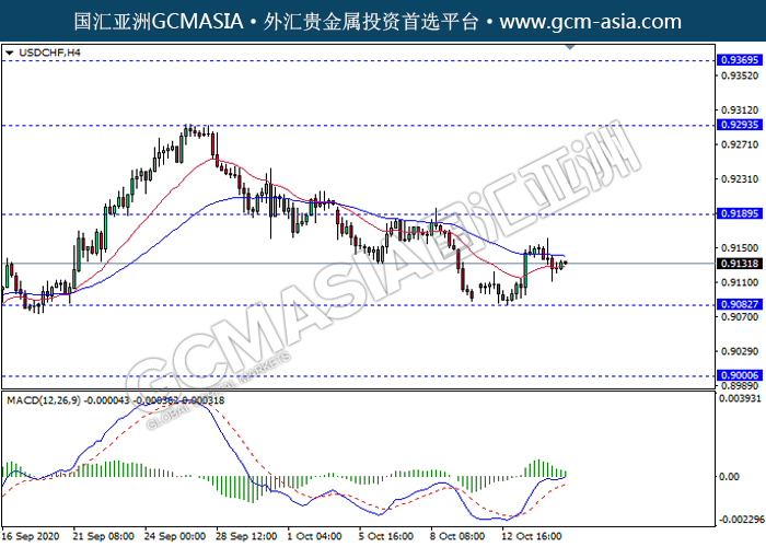 20201015 USDCHF by keyk | Oct 15, 2020 | 美元兑瑞士法郎 | 0 comments GCMAsia - USDCHF USDCHF 2020-10-15 USDCHF,H4:美瑞近期高位回调。MACD多头动能略减,短期关注空头趋势为主。上方关注0.9190压力和0.9295压力,下方关注0.9080支撑和0.9000支撑。
