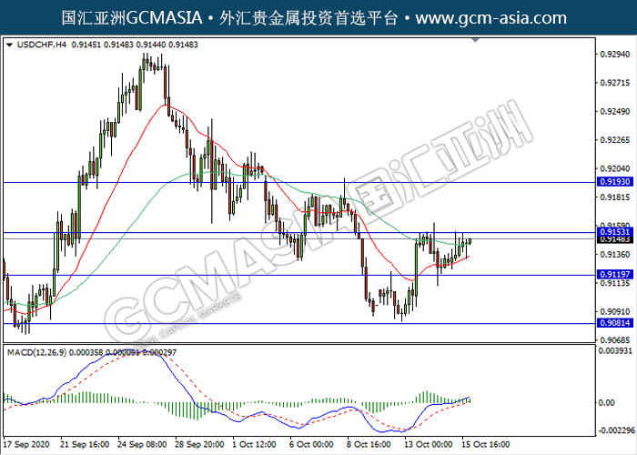 USDCHF,H4:美瑞震荡上行,目前测试前期压力。MACD动能略增,若突破关注多头趋势为主。上方关注0.9155压力和0.9195压力,下方关注0.9120支撑和0.9080支撑。