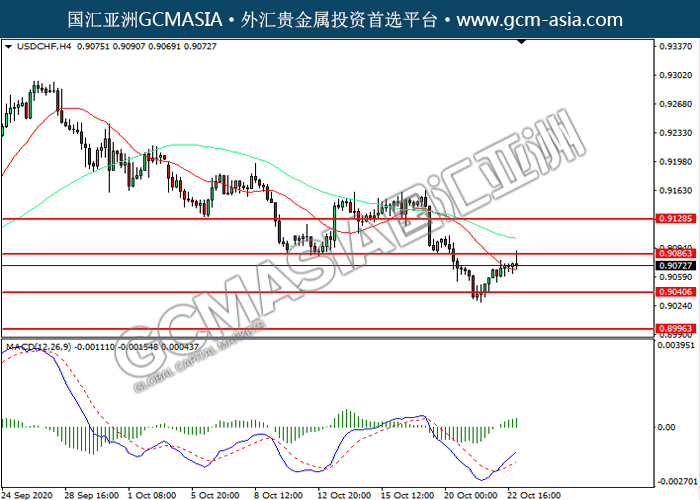 USDCHF,H4:美瑞震荡上行,目前测试前期压力。MACD多头动能偏强,若突破可关注多头走势为主。上方关注0.9185压力和0.9230压力,下方关注0.9040支撑和0.8995支撑。