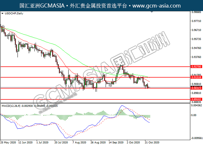 USDCHF,Daily:美瑞震荡下行,目前测试前期支撑。然而,MACD空头动能略减,短期可关注技术性回调为主。上方关注0.9150压力和0.9270压力,下方关注0.9030支撑和0.8910支撑。