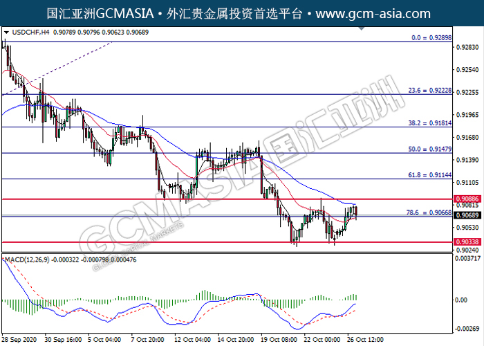 USDCHF,H4:美瑞高位承压后回落,目前测试着支撑位。MACD多头动能略减,若突破可持续关注空头回落为主。上方关注0.9090压力和0.9115压力,下方关注0.9065支撑和0.9035支撑。