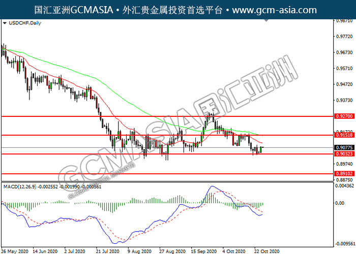 20201027 USDCHF by willy | Oct 27, 2020 | 美元兑瑞士法郎 | 0 comments GCMAsia-USDCHF USDCHF 2020-10-27 USDCHF,Daily:美瑞低位反弹。MACD空头动能略减,短期可关注多头为主。上方关注0.9150压力和0.9270压力,下方关注0.9030支撑和0.8910支撑。