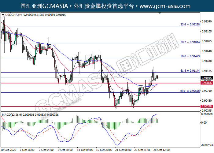 20201029 USDCHF-午间 by keyk | Oct 29, 2020 | 美元兑瑞士法郎 | 0 comments GCMAsia - USDCHF USDCHF 2020-10-29 USDCHF,H4:美瑞高位承压后回落。MACD多头动能略减,短期可持续关注空头为主。上方关注0.9115压力和0.9150压力,下方关注0.9090支撑和0.9065支撑。