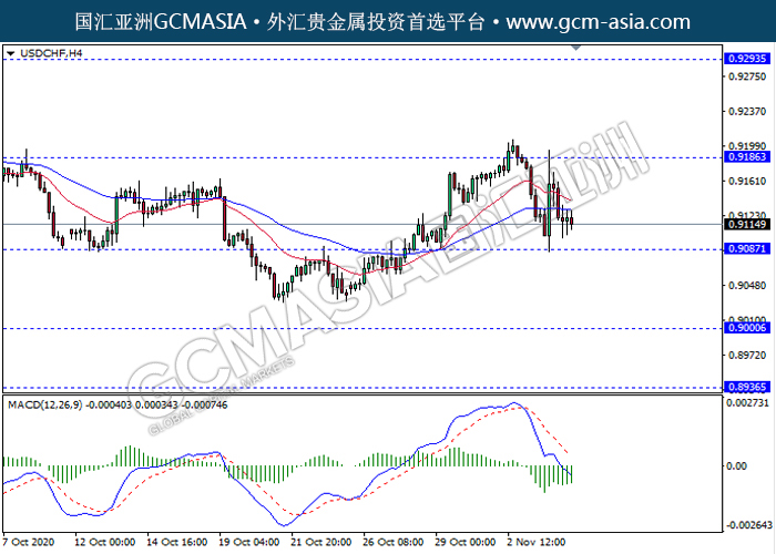 USDCHF,H4:美瑞高位承压回落,目前测试靠近前期支撑。MACD动能持续略减,若突破继续关注空头趋势为主。上方关注0.9185压力和0.9295压力,下方关注0.9085支撑和0.9000支撑。