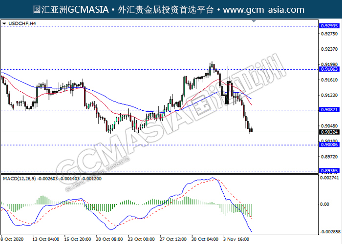 20201106 USDCHF by keyk | Nov 6, 2020 | 美元兑瑞士法郎 | 0 comments GCMAsia - USDCHF USDCHF 2020-11-06 USDCHF,H4:美瑞突破前期支撑,空头排列。MACD动能持续略减,短期继续看空趋势为主。上方关注0.9085压力和0.9185压力,下方关注0.9000支撑和0.8935支撑。