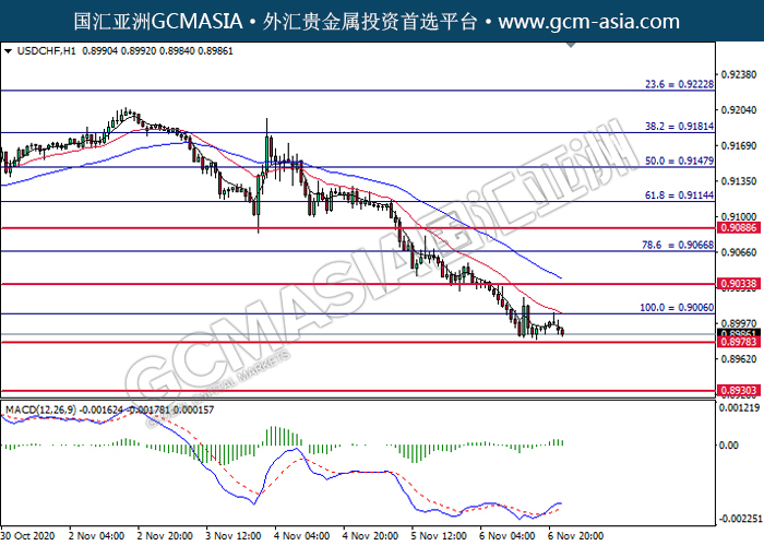 USDCHF,H1:美瑞高位承压后回落,目前测试靠近支撑位。MACD动能持续偏减,若突破可继续关注空头趋势为主。上方关注0.9005压力和0.9035压力,下方关注0.8980支撑和0.8930支撑。