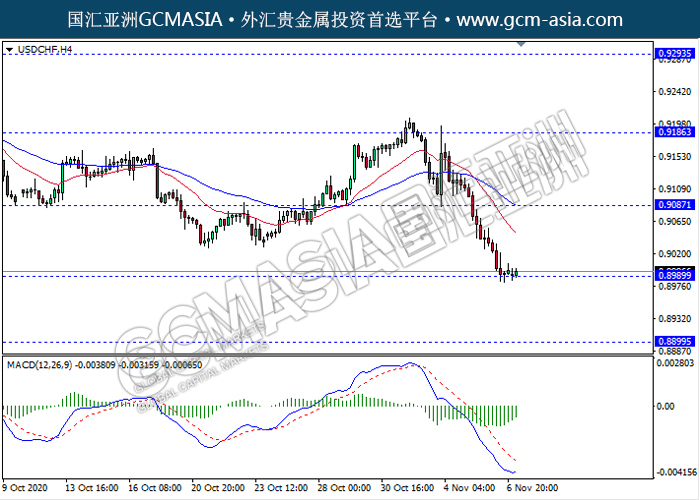 USDCHF,H4:美瑞空头排列,目前测试前期支撑。然而,MACD空头动能有所略减,短期关注技术性多头反弹趋势为主。上方关注0.9085压力和0.9185压力,下方关注0.9000支撑和0.8900支撑。