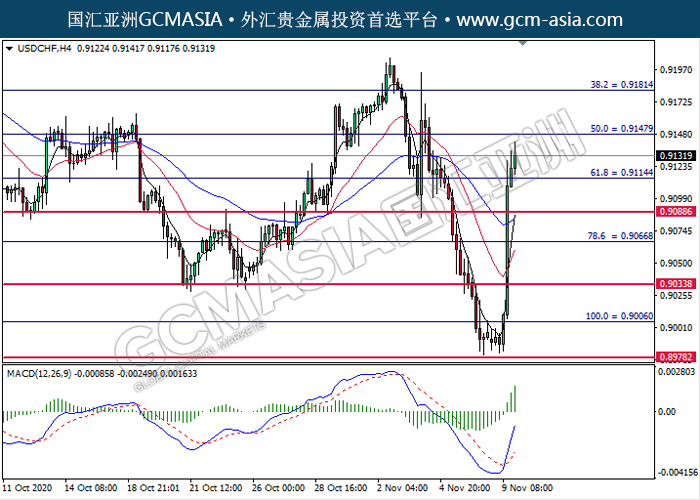 USDCHF,H4:美瑞震荡上行,目前测试前期压力。然而,MACD多头动能有所略减,短期可关注技术性回调为主。上方关注0.9150压力和0.9180压力,下方关注0.9090支撑和0.9035支撑。