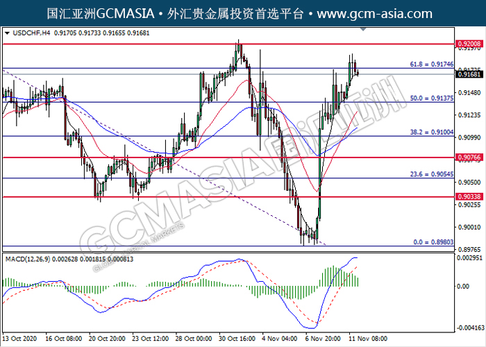 20201112 USDCHF by willy | Nov 12, 2020 | 美元兑瑞士法郎 | 0 comments GCMAsia-USDCHF USDCHF 2020-11-12 USDCHF,H4:美瑞高位承压后回落。MACD动能持续偏减,短期可继续关注空头趋势为主。上方关注0.9175压力和0.9200压力,下方关注0.9135支撑和0.9100支撑。