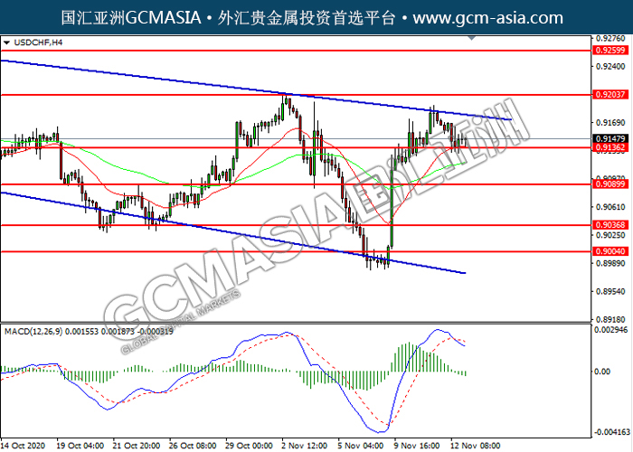 USDCHF,H4:美瑞震荡下行,目前测试前期支撑。MACD空头动能有所略增,若下破可关注空头为主。上方关注0.9205压力和0.9260压力,下方关注0.9135支撑和0.9090支撑。