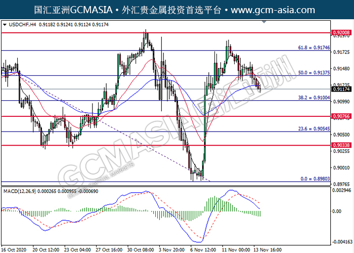 20201116 USDCHF-午间 by willy | Nov 16, 2020 | 美元兑瑞士法郎 | 0 comments GCMAsia-USDCHF USDCHF 2020-11-16 USDCHF,H4:美瑞突破后持续下行。MACD动能持续略减,短期可关注空头趋势为主。上方关注0.9135压力和0.9175压力,下方关注0.9100支撑和0.9075支撑。