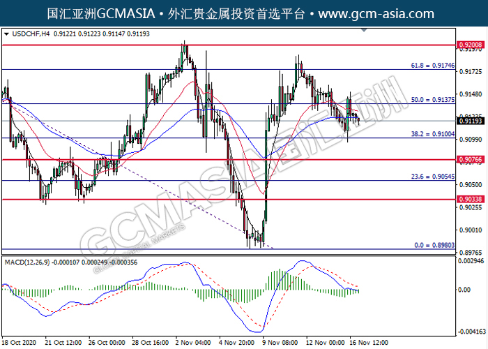USDCHF,H4:美瑞高位承压后回落。然而,MACD动能持续略增,短期可关注技术性多头为主。上方关注0.9135压力和0.9175压力,下方关注0.9100支撑和0.9075支撑。