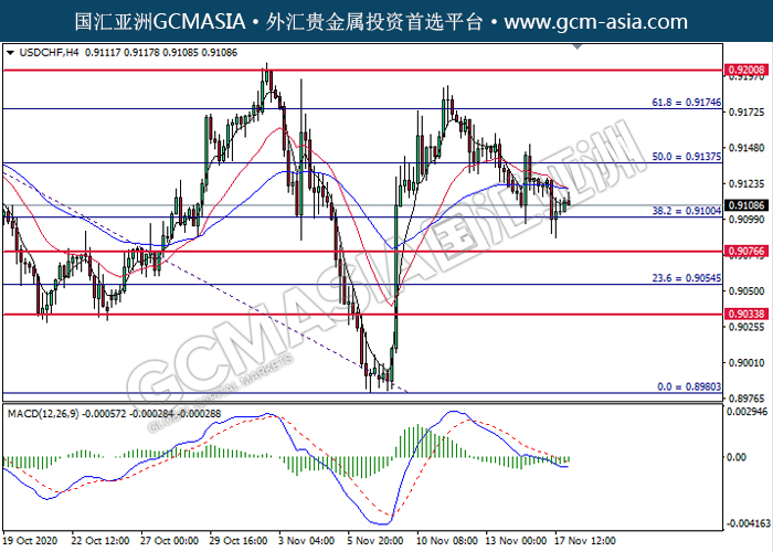 20201118 USDCHF by keyk | Nov 18, 2020 | 美元兑瑞士法郎 | 0 comments GCMAsia - USDCHF USDCHF 2020-11-18 USDCHF,H4:美瑞低位反弹。MACD动能持续略增,短期可关注多头为主。上方关注0.9135压力和0.9175压力,下方关注0.9100支撑和0.9075支撑。