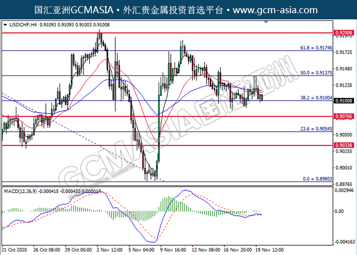 USDCHF,H4:美瑞高位承压后回落,目前测试着支撑位。MACD动能持续略减,短期可关注空头为主。上方关注0.9135压力和0.9175压力,下方关注0.9100支撑和0.9075支撑。