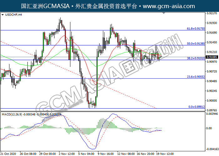 USDCHF,H4:美瑞高位回落,目前测试前期支撑。MACD多头动能有所略减,若下破可关注空头为主。上方关注0.9140压力和0.9175压力,下方关注0.9100支撑和0.9055支撑。