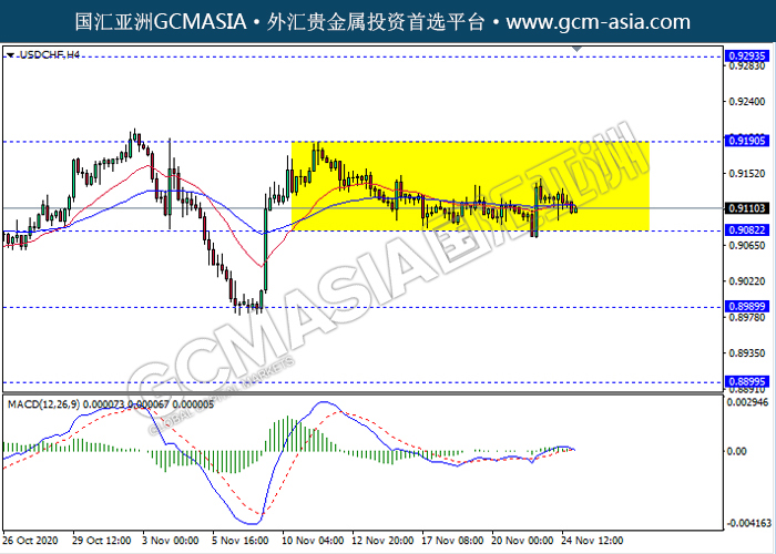 USDCHF,H4:美瑞仍区间交易,目前测试靠近前期支撑。然而,MACD开始形成死叉,多头动能略减,若突破关注空头趋势为主。上方关注0.9190压力和0.9295压力,下方关注0.9080支撑和0.8990支撑。