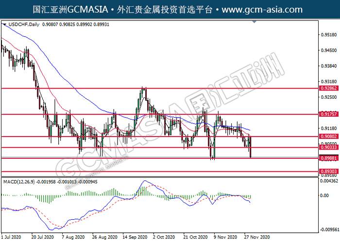 20201202 USDCHF by willy | Dec 2, 2020 | 美元兑瑞士法郎 | 0 comments GCMAsia-USDCHF USDCHF 2020-12-02 USDCHF,Daily:美瑞突破后持续下行。MACD动能转弱,短期可关注空头走势为主。上方关注0.9035压力和0.9080压力,下方关注0.8990支撑和0.8930支撑。