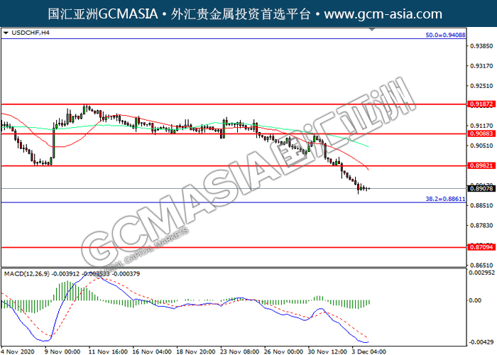 20201204 USDCHF-午间 by keyk | Dec 4, 2020 | 美元兑瑞士法郎 | 0 comments GCMAsia - USDCHF USDCHF USDCHF,H4:美瑞下破前期支撑,震荡下行。然而,MACD空头动能略减,短期可关注技术性回调为主。上方关注0.8980压力和0.9090压力,下方关注0.860支撑和0.8710支撑。