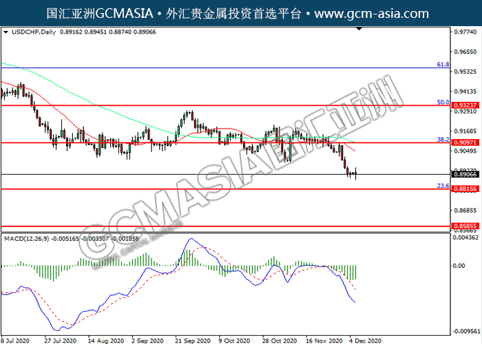 USDCHF,Daily:美瑞震荡下行。然而,MACD空头动能略减少,短期可关注技术性回调为主。上方关注0.9095压力和0.9325压力,下方关注0.8815支撑和0.8585支撑。
