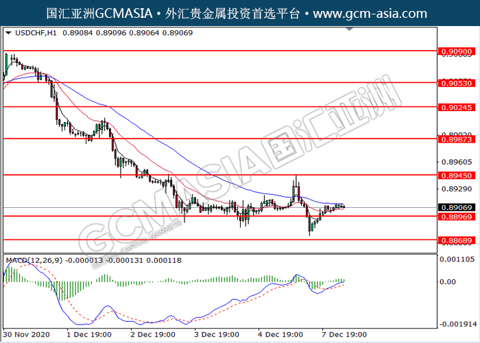 20201208 USDCHF-午间 by keyk | Dec 8, 2020 | 美元兑瑞士法郎 | 0 comments GCMAsia-USDCHF USDCHF 2020-12-08 USDCHF,H4:美瑞突破后持续上行。MACD动能持续增加,短期可关注多头为主。上方关注0.8945压力和0.8985压力,下方关注0.8895支撑和0.8870支撑。